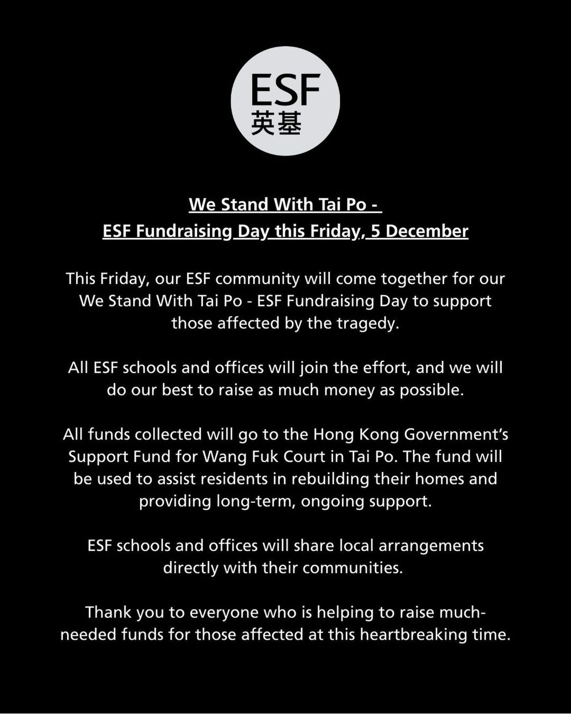 We are all deeply saddened by the recent tragic fire at Wang Fuk Court in Tai Po, which has devastated many families in our community. In response, ESF are launching a collective effort to provide support.